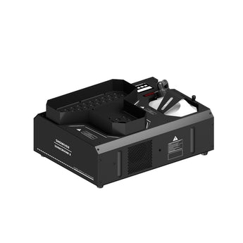 Cette machine est équipée d’un système de compression permettant de dynamiser le jet « façon Co2 » et intègre un éclairage de 35x5W LED RGB haute puissance pour assurer la coloration de la fumée.