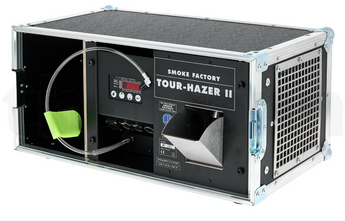 Deux canaux DMX permettent un effet individuel qui peut être ajusté d'une brume très fine, à peine visible, à une sortie de type fumée. Seulement 60 secondes après avoir branché le câble d'alimentation, le Tour Hazer II est chauffé et prêt à l'emploi. Sa conception en flight permet à la TOUR HAZER II de pouvoir fonctionner dans tous les sens sans problème. Horizontale, verticale, ou encore sur la tranche, la TOURHAZER fonctionnera parfaitement. Avec le déflecteur d'air variable, le Haze peut toujours être dirigé dans la direction souhaitée. La TOUR HAZER II existe en 4 versions : la version BOX, sans flight case pour de l'installation fixe, la version "S" avec un flight case vintage betonex, la version "SF" avec un flight case noir et la version "A" avec un flight case haut de gamme Amptown.